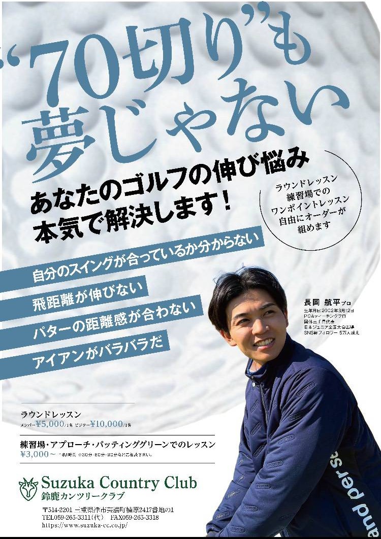 鈴鹿カンツリークラブ所属ティーチングプロ長岡 航平プロラウンドレッスン・練習場でのワンポイントレッスンを承ります。【 ラウンドレッスン(1名)】メンバー 5,000円 / ビジター 10,000円【 練習場・アプローチ・パッティンググリーンでのレッスン 】 3,000円〜(1名・1時間) ※30分・60分・90分などご相談下さい。ご希望のお客様はフロントまでご連絡くださいませ。