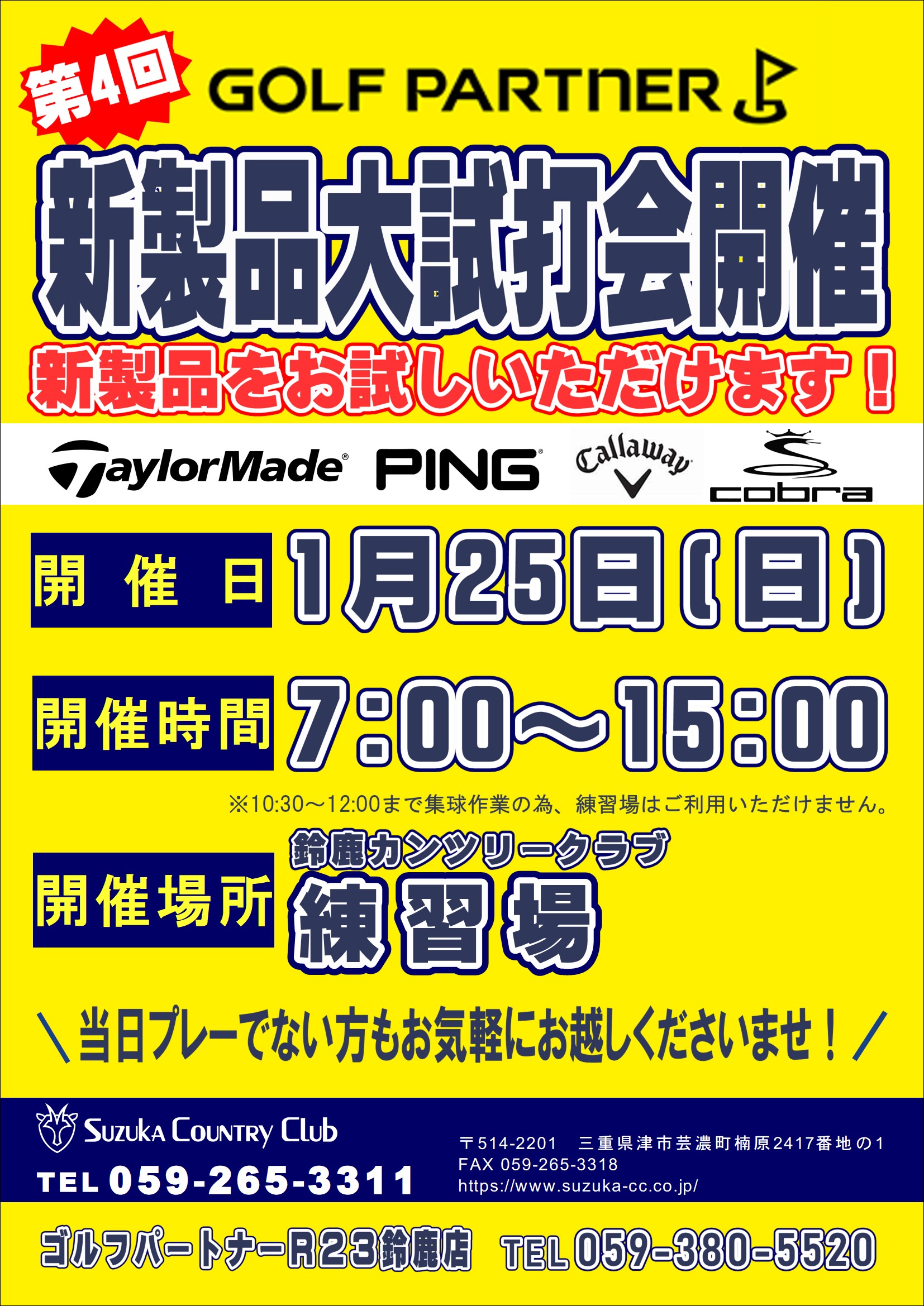 1月25日(日) 7:00~15:00ゴルフパートナーR23鈴鹿店さんご協力のもと最新製品クラブを練習場にてご用意いたします。最新製品クラブを鈴鹿カンツリークラブの練習場にて実際に体感して下さい!!※10:30~12:00まで集球作業の為、練習場はご利用いただけません。 気軽にご参加ください。